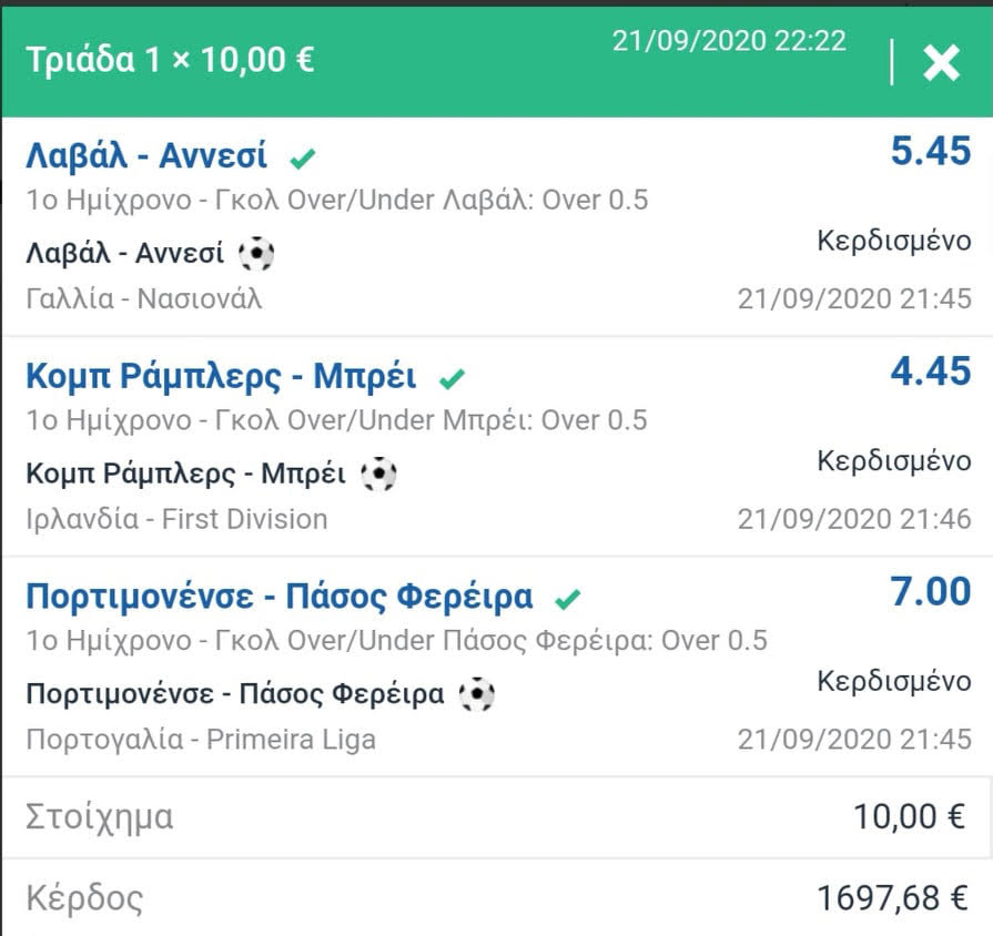 Η Δευτέρα, όμως, συνέχισε να μοιράζει κέρδη στους παίκτες του Stoiximan, με έναν ακόμη παίκτη να προβλέπει σωστά σε τρεις αγώνες στην Πορτογαλία, την Γαλλία και την Ιρλανδία ποντάροντας στο να βάλει γκολ στο πρώτο ημίχρονο, η Λαβάλ στο Λαβάλ-Αννεσί, η Μπρέι στο Κομπλ Ράμπλερς-Μπρέι και η Πάσος Φερέιρα στο Πορτιμονένσε-Πάσος Φερέιρα και κατάφερε με ποντάρισμα 10 ευρώ να κερδίσει 1.697,68 ευρώ!