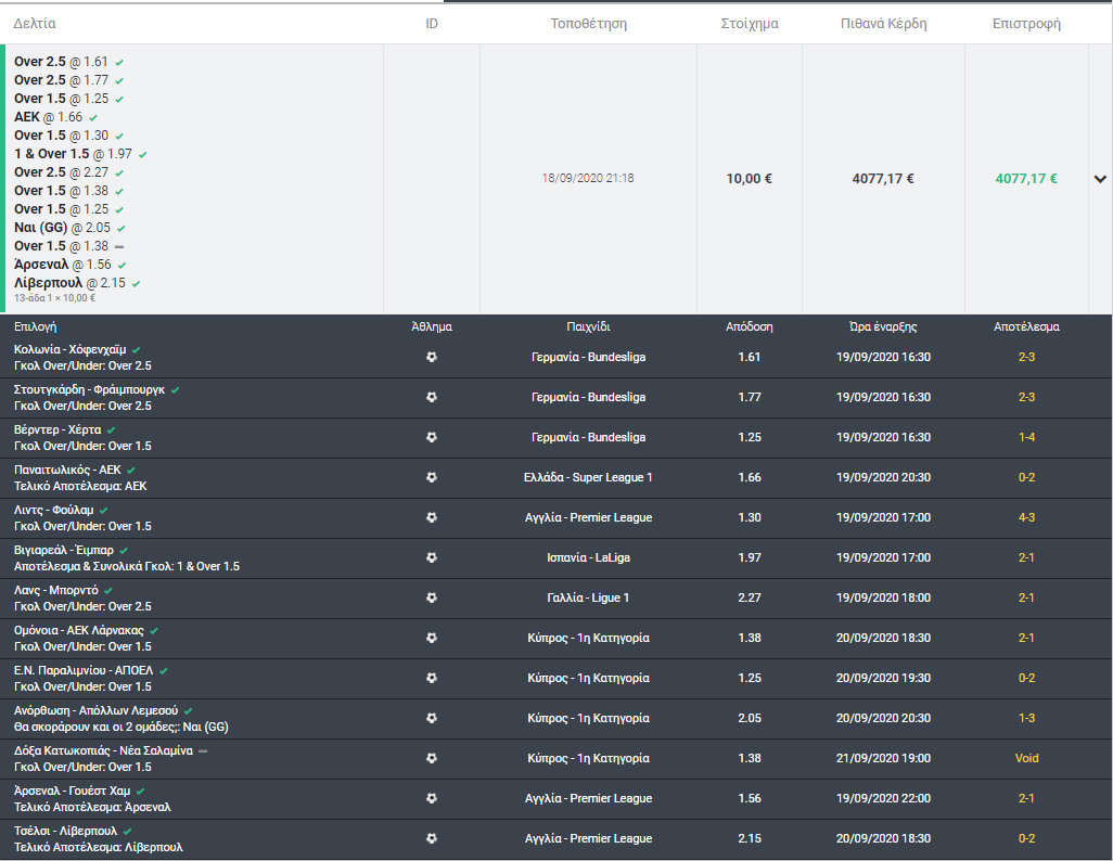 Στο κουπόνι του είχε αγώνες από όλα τα πρωταθλήματα και το κυπριακό, καθώς προέβλεψε σωστά το Over 1.5 γκολ στο Ομόνοια-ΑΕΚ, στο ΕΝΠ-ΑΠΟΕΛ και το Goal-Goal στο Ανόρθωση-Απόλλων και στα ξένα πρωταθλήματα με τις νίκες Άρσεναλ, Λίβερπουλ, της ΑΕΚ κόντρα στον Παναιτωλικό στη Super League, το Over 2.5 γκολ στη Γερμανία, στα ματς της Κολωνίας με τη Χόφενχαϊμ , της Στουτγκάρδης με τη Φράιμπουργκ, αλλά δεν σταμάτησε εδώ! Προέβλεψε επίσης σωστά το Over 1.5 γκολ στο Βέρντερ Χέρτα, το Over 1.5 γκολ στο Λιντς Φούλαμ, το Over 2.5 γκολ στο Λανς Μπορντό και τέλος τον συνδυασμό άσσο τελικό και Over 1.5 γκολ στο Βιγιαρεάλ Έιμπαρ και έπιασε …13άρι!