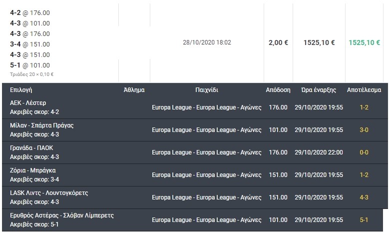 Συγκεκριμένα, ο μεγάλος τυχερός επέλεξε να ποντάρει στο ακριβές σκορ σε 6 αγώνες, συγκεκριμένα στο ΑΕΚ-Λέστερ 4-2, στο Μίλαν-Σπάρτα Πράγας 4-3, στο Ζόρια-Μπράγκα 3-4, στο LASK Λιντς-Λουντογκόρετς 4-3, στο Ερυθρός Αστέρας-Σλόβαν Λίμπερετς 5-1 και στο Γρανάδα-ΠΑΟΚ 4-3. Ο τυχερός ζητούσε τριάδες στους αγώνες που επέλεξε και τελικά προέβλεψε σωστά τα σκορ δύο αγώνων, του LASK Λιντς-Λουντογκόρετς και του Ερυθρός Αστέρας-Σλόβαν Λίμπερετς και ήθελε άλλον έναν αγώνα για να κλείσει την τριάδα. Χάρη στην προσφορά «Λευκή Επιστροφή» του Stoiximan που προβλέπει ότι όταν ποντάρει ένας παίκτης στο τελικό σκορ ενός αγώνα και έρθει 0-0, τότε ο αγώνας υπολογίζεται σαν μονάδα, κατάφερε να κλείσει την τριάδα που έψαχνε με συνολική απόδοση ύψους 15.251 και με αξία της στήλης στα €0,10, εισέπραξε το συνολικό ποσό των €1,525.10!
