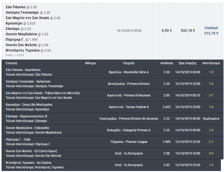 Συγκεκριμένα, ο τυχερός πόνταρε στη νίκη της Σάο Πάουλο κόντρα στην Κορίνθιανς στο βραζιλιάνικο πρωτάθλημα, στη νίκη της Λανέρος Γκουανάρε κόντρα στην Αράγκουα στο πρωτάθλημα της Βενεζουέλας, στη νίκη της Σαν Μαρτίν ντε Σαν Χουάν για τη β’ κατηγορία της Αργεντινής, στη νίκη της Κρουσέρο κόντρα στη Σπορτίβο Μπελγράνο για το Torneo Federal A της Αργεντινής, στη νίκη της Σανσάρε κόντρα στην Κομουνικασιόνες Β’ για το πρωτάθλημα της Γουατεμάλα, στη νίκη της Ουνιόν Μαγδαλένα κόντρα στην Ενβιγκάδο για το πρωτάθλημα της Κολομβίας, στη νίκη της Πόρτμορ Γ. κόντρα στην Ούβι για το πρωτάθλημα της Τζαμάικα και τέλος στη Χιλή, στη νίκη της Ουνιόν Σαν Φελίπε κόντρα στη Σάντα Κρουζ και στη νίκη της Ντεπόρτες Τεμούκο κόντρα στη Λα Σερένα.