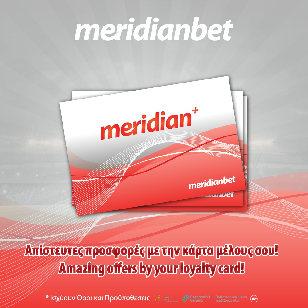 Η Meridianbet σας παρουσιάζει την Meridian+ loyalty card που σκοπό έχει να επιβραβεύσει τους πελάτες της. Σεβόμενη όσους την στηρίζουν η Meridianbet προσφέρει σε όλους εσάς την ευκαιρία να αυξήσετε τα οφέλη σας μέσω της Loyalty Card που μόνο σε εμάς μπορείτε να βρείτε. Μέσω αυτής της κάρτας οι πελάτες μας θα μπορούν να επωφεληθούν διάφορες προσφορές όσο αφορά τον στοιχηματισμό. Αρχής γενομένης με Μπόνους και στην συνέχεια θα ακολουθήσουν πολλές άλλες εκπλήξεις.