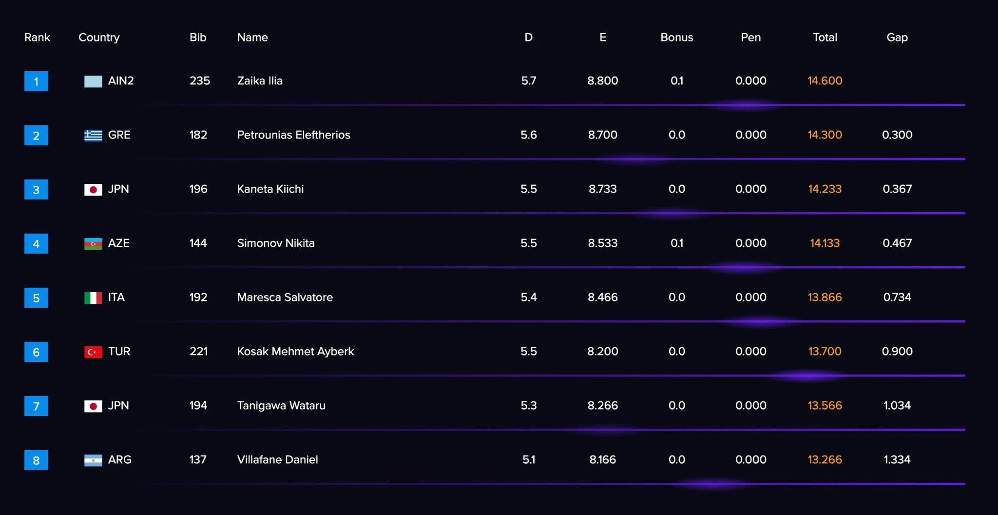 Ο 24χρονος Ιάπωνας Κιίτσι Κανέτα ήταν τρίτος με βαθμολογία 14.233β (5.5, 8.733β) και κέρδισε στις λεπτομέρειες τον Αζέρο Νικίτα Σιμόνοφ που είχε τον ίδιο βαθμό δυσκολίας αλλά με ελαφρώς χειρότερη εκτέλεση έμεινε στους 14.133β (5.5, 8.533β).