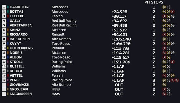 Ο Μπότας έφυγε καλά και παρα την πίεση από τον Χάμιλτον κατάφερνε να κρατηθεί μπροστά. Ο Φινλανδός μπήκε στα pits πρώτος και περίμενε την είσοδο του Χάμιλτον για να ξαναβγεί μπροστά του. Μόνο που λογάριαζε χωρίς το αυτοκίνητο ασφαλείας. Ο Τζιοβινάτζι στον 20ο γύρο είχε μία έξοδο, το safety car μπήκε και έδωσε την ευκαιρία στον Χάμιλτον να μπει στα pits να κάνει το pit stop του και να ξαναβγει μπροστά.
