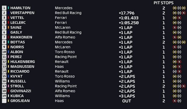 Η Mercedes έβαλε ξανά στα πιτς τον παγκόσμιο πρωταθλητή στον 49ο γύρο, του έβαλε τη μεσαία γόμα κάνοντας τον Χάμιλτον να πετά στους τελευταίους γύρους. Με τη διαφορά στα 20 δευτερόλεπτα ο Βρετανός κατάφερε να την καλύψει και τρεις γύρους πριν τον τέλος του επέτρεψαν να προσπεράσει τον Φερστάπεν που δεν μπορούσε να κάνει τίποτα.