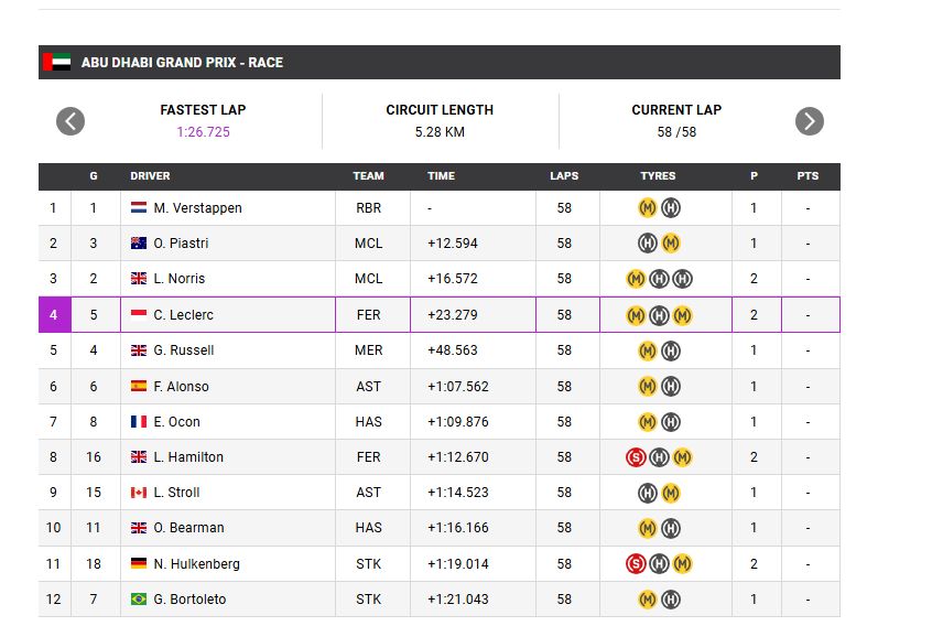 Η μάχη για τον τίτλο ήταν τριπλή, μπαίνοντας στον τελευταίο αγώνα της χρονιάς, με τον Όσκαρ Πιάστρι να είναι ο τριτος διεκδικητής. Ο Αυστραλός με την άλλη McLaren έκανε κι αυτός το καλύτερο που μπορούσε, και μαζί ένα από τα πιο εντυπωσιακά προσπεράσματα της χρονιάς πάνω στον Νόρις στο ξεκίνημα του αγώνα, αλλά η 2η θέση που πήρε τελικά δεν μπορούσε να τον φέρει ψηλότερα στη βαθμολογία. Έναν από τους καλύτερους φετινούς του αγώνες έκανε ο Σαρλ Λεκλέρ με τη Ferrari, παίρνοντας την 4η θέση. Ο Μονεγάσκος είχε πολύ καλό ρυθμό στη Γιας Μαρίνα που σε πολλά σημεία του αγώνα ήταν ανταγωνιστικός με των πρωτοπόρων. Η Ferrari κλείνει μια πολύ δύσκολη χρονιά με ένα θετικό αποτέλεσμα και κοιτάζει πλέον στην επόμενη. Ακολούθησαν οι Ράσελ, Αλόνσο, Οκόν, Χάμιλτον (που είχε ξεκινήσει 16ος), Μπέρμαν και Στρολ.