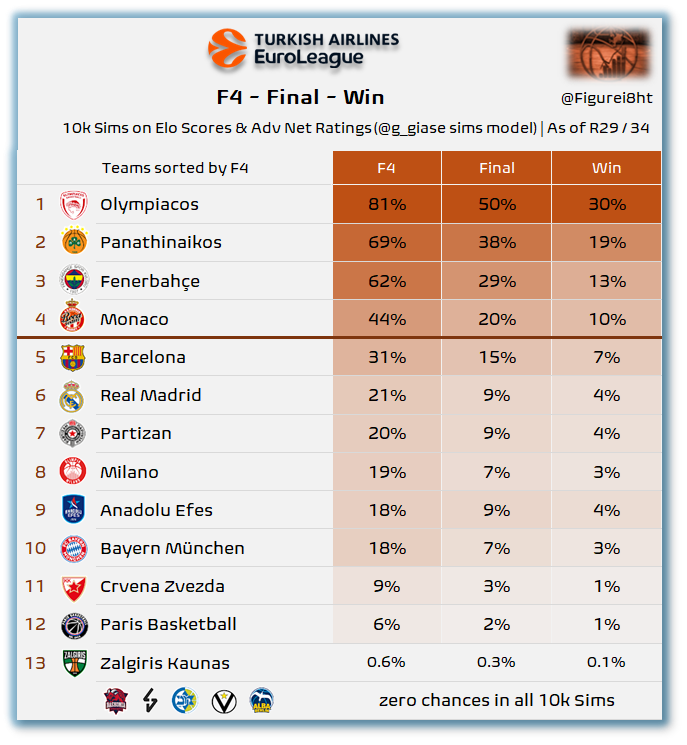 Η ιστοσελίδα «Figurei8ht», που ασχολείται με προβλέψεις, ανάρτησε νέο πίνακα μετά το πέρας της 29ης αγωνιστικής της κανονικής διάρκειας της Euroleague, με τις τρεις ομάδες να συνεχίζουν να είναι ακλόνητα φαβορί.