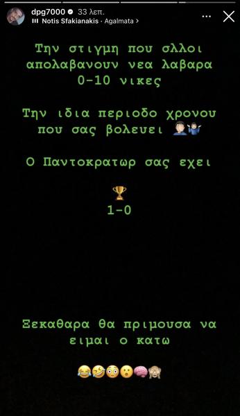 Συγκεκριμένα, ο ιδιοκτήτης της «πράσινης» ΚΑΕ έγραψε σε story στο Instagram: «Την ίδια στιγμή που άλλοι απολαμβάνουν νέα λάβαρα 0-10 νίκες. Την ίδια περίοδο χρόνο που σας βολεύει… Ο Παντοκράτωρ σας έχει 1-0», ήταν το μήνυμα του Δημήτρη Γιαννακόπουλου.