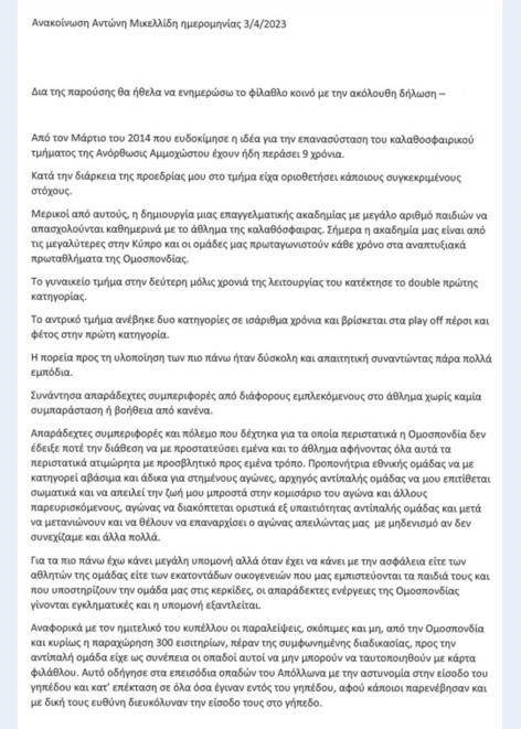 Την παραίτησή του από την προεδρία της επιτροπής καλαθόσφαιρας της Ανόρθωσης γνωστοποίησε μέσω επιστολής του ο Αντώνης Μικελλίδης.