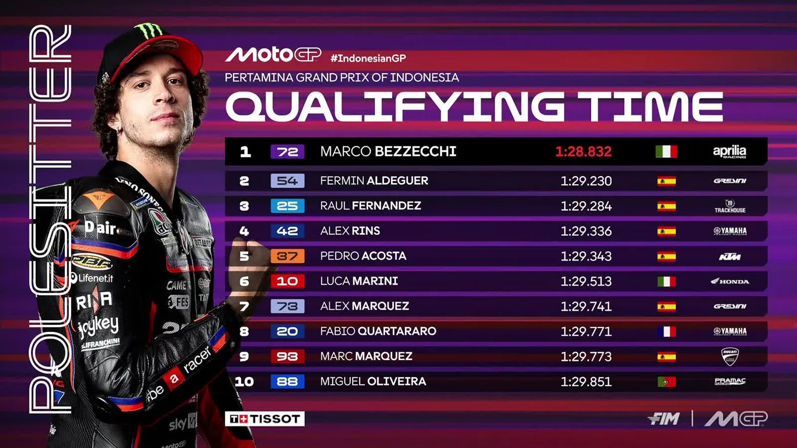 Ο πρωταθλητής Μαρκ βελτίωσε τον χρόνο του στο τέλος φτάνοντας στο 1:29.773, όμως αυτό ήταν αρκετό μόνο για την ένατη θέση – στην εξωτερική της τρίτης σειράς. Δίπλα του θα ξεκινήσει ο Μιγκέλ Ολιβέιρα με την Pramac Yamaha, ενώ την τέταρτη σειρά συμπληρώνουν οι Φάμπιο Ντι Τζιαναντόνιο (VR46) και Χουάν Μιρ (Honda).