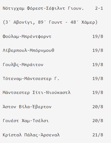 Μόλις στο 3ο λεπτό, το σκορ για τους γηπεδούχους άνοιξε ο Αβονίγι, με τον Χάμερ να ισοφαρίζει για τους φιλοξενούμενους στο 48ο λεπτό. Όμως, o Nεοζηλανδός διεθνής επιθετικός Κρις Γουντ ήταν ο παίκτης που πέτυχε το «χρυσό» γκολ της νίκης για τη Νότιγχαμ στο 89ο λεπτό. Μετά την ήττα με 2-1 στο «Έμιρεϊτς» στην πρεμιέρα, η Νότιγχαμ Φόρεστ... έκανε σεφτέ στην έδρα της, ενώ η Σέφιλντ Γιουνάιτεντ έμεινε στο μηδέν.