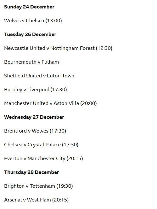 Λίβερπουλ εναντίον Νιούκαστλ τη Δευτέρα 1 Ιανουαρίου και Γουέστ Χαμ εναντίον Μπράιτον την Τρίτη 2 Ιανουαρίου ολοκληρώνουν τους αγώνες.