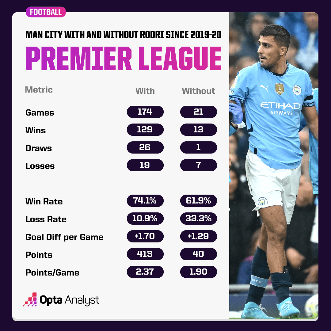Συγκεκριμένα, από τη στιγμή που ήρθε στη Σίτι, τη σεζόν 2019-20, ο Ρόδρι έχει χάσει 21 αγώνες Premier League. Από αυτούς, οι «πολίτες» έχουν ηττηθεί στους 7, στο 1/3 δηλαδή των αναμετρήσεων! Όχι και τόσο ανίκητη...