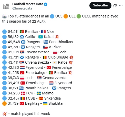 Η έγκυρη σελίδα Football Meets Data, έρχεται ανανεωμένη και μας παρουσιάζει όλα τα φετινά ματς του Champions League με την επίσης μεγαλύτερη προσέλευση. Στην 7η θέση το Ερυθρός Αστέρας - Πάφος με παρουσία κόσμου που έφτασε τις 43411, ενώ πρώτο είναι το Μπενφίκα - Νις με 64511 θεατές. Με αστεράκι στην πιο κάτω φωτογραφία τα ματς που παίχτηκαν αυτή την εβδομάδα.