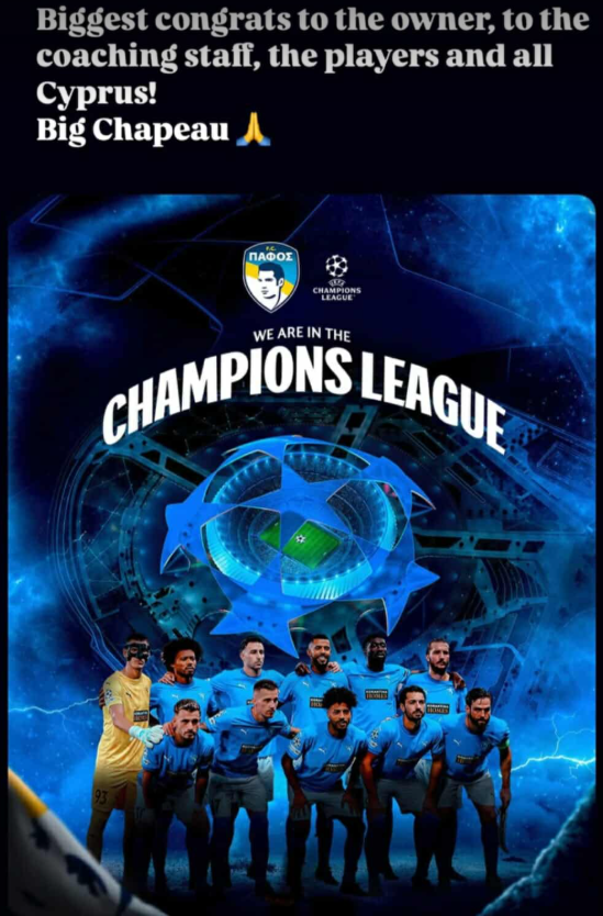 «Τα πιο μεγάλα συγχαρητήρια στον ιδιοκτήτη, στο προπονητικό επιτελείο, στους παίκτες και σε όλη την Κύπρο. Τεράστια υπόκλιση», έγραψε ο Σπιλέβσκι.