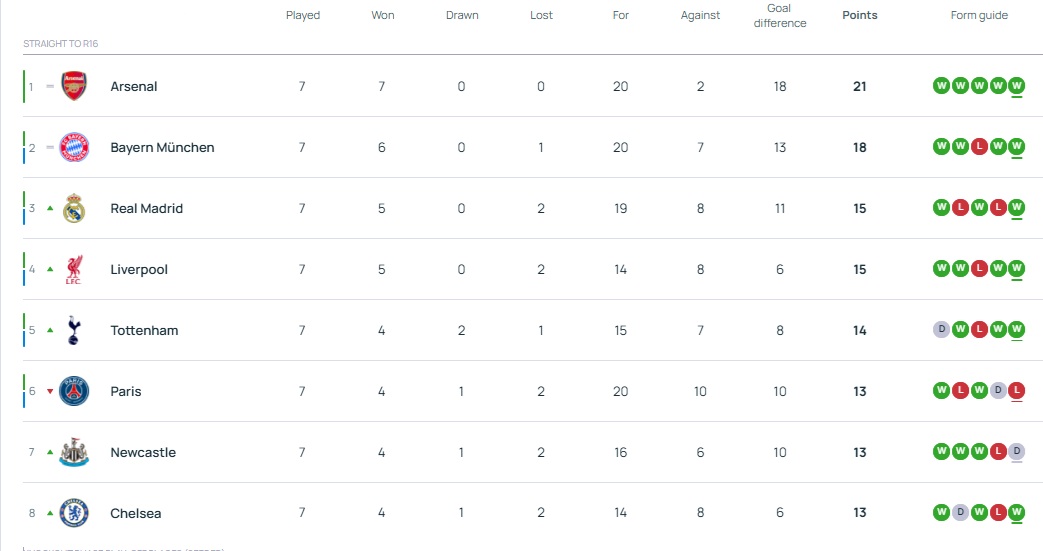 Στην πρώτη θέση παραμένει η Άρσεναλ με 21 βαθμούς και τρεις περισσότερους από τη δεύτερη Μπάγερν Μονάχου.