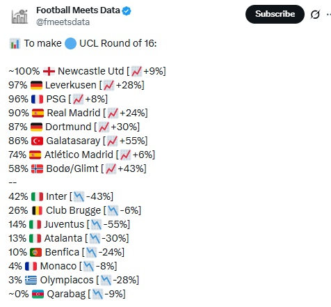 Ωστόσο, ο Ολυμπιακός δεν χρειάζεται μόνο τη νίκη, αλλά τουλάχιστον δύο γκολ διαφορά. Και το 18% στα σενάρια πρόκρισης μειώνεται στο 3%, με τη Λεβερκούζεν να βρίσκεται κατά… 97% στις 16 καλύτερες ομάδες της κορυφαίας διασυλλογικής διοργάνωσης.