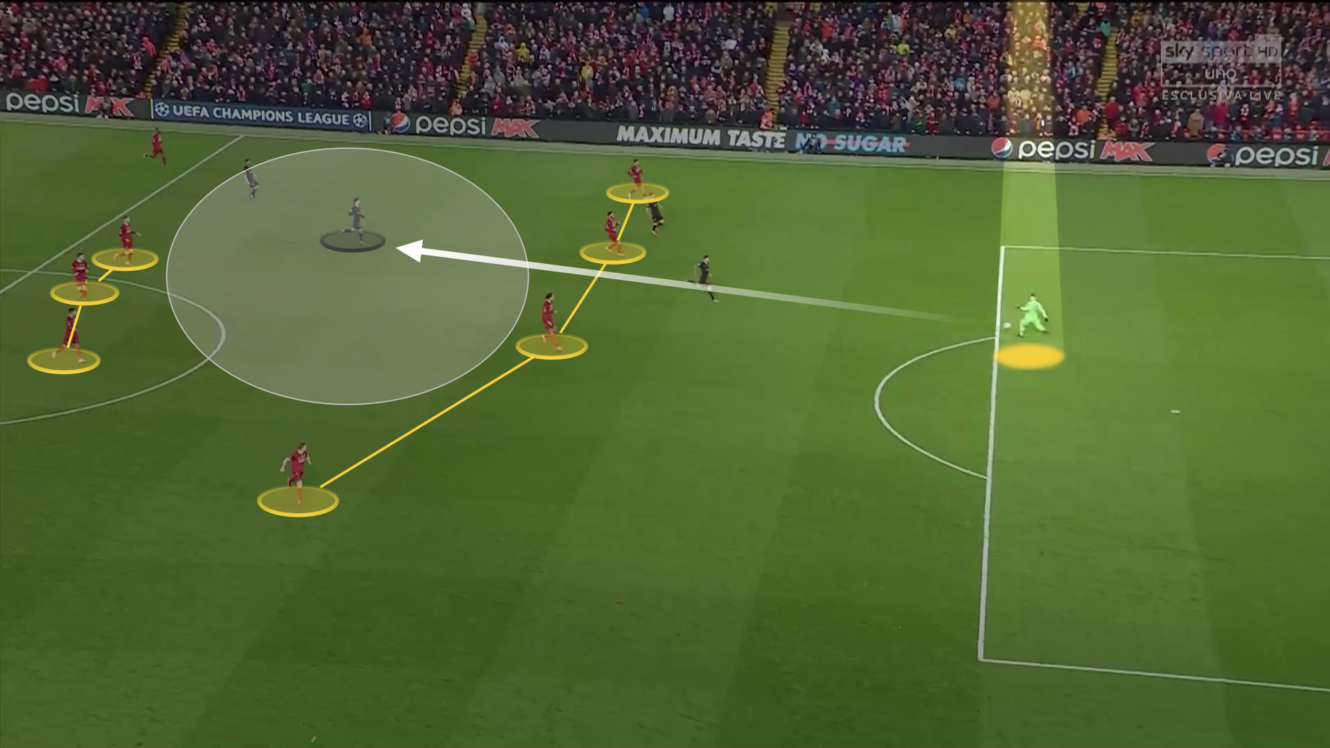 Βλέπουμε πιο κάτω την φάση όπου η μπάλα δεν ήταν και τόσο πιεσμένη από πλευράς Ατλέτικο στην πίσω πάσα προς τον τερματοφύλακα ενώ αυτός επιλέγει να πασάρει ανάμεσα στις γραμμές της ομάδας του. Εκεί ήταν αμαρκάριστος ο Joao Felix που έβγαλε τελικά την ασίστ για το γκολ ενώ μπορούσε ο τερματοφύλακας Adrian να πασάρει στην άλλη πλευρά όπου ο Milner ήταν μόνος να οργανωθεί ξανά η επίθεση της Λίβερπουλ.