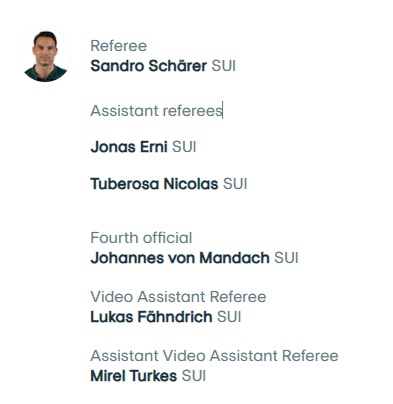 Από Ελβετία όλη η ομάδα των ρεφ, με τον Sandro Schärer να ορίζεται ως ο επικεφαλής της αναμέτρησης. Το ματς της Πέμπτης θα είναι το 10ο του φετινό (ήταν και στο Ντιναμό Κιέβου - Πάφος) και 5ο στην Ευρώπη, ενώ η τελευταία του αναμέτρηση ήταν FC Aarau - FC Sion (1-3) στις 4 Δεκεμβρίου.