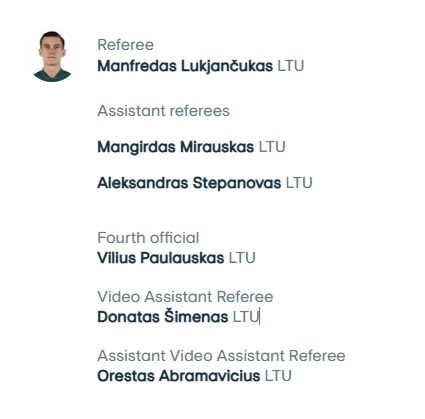 Από Λιθουανία όλη η ομάδα των ρεφ, με τον Manfredas Lukjančukas να ορίζεται ως ο επικεφαλής της αναμέτρησης. Το ματς της Πέμπτης θα είναι το μόλις το 5ο του φετινό με τα προηγούμενα τέσσερα να ήταν όλα στην Ευρώπη. Δεύτερη φορά που φέτος έρχεται Κύπρο ο συγκεκριμένος διαιτητής, αφού ήταν και ο ρεφ του αγώνα Πάφος-Μπάγερν!