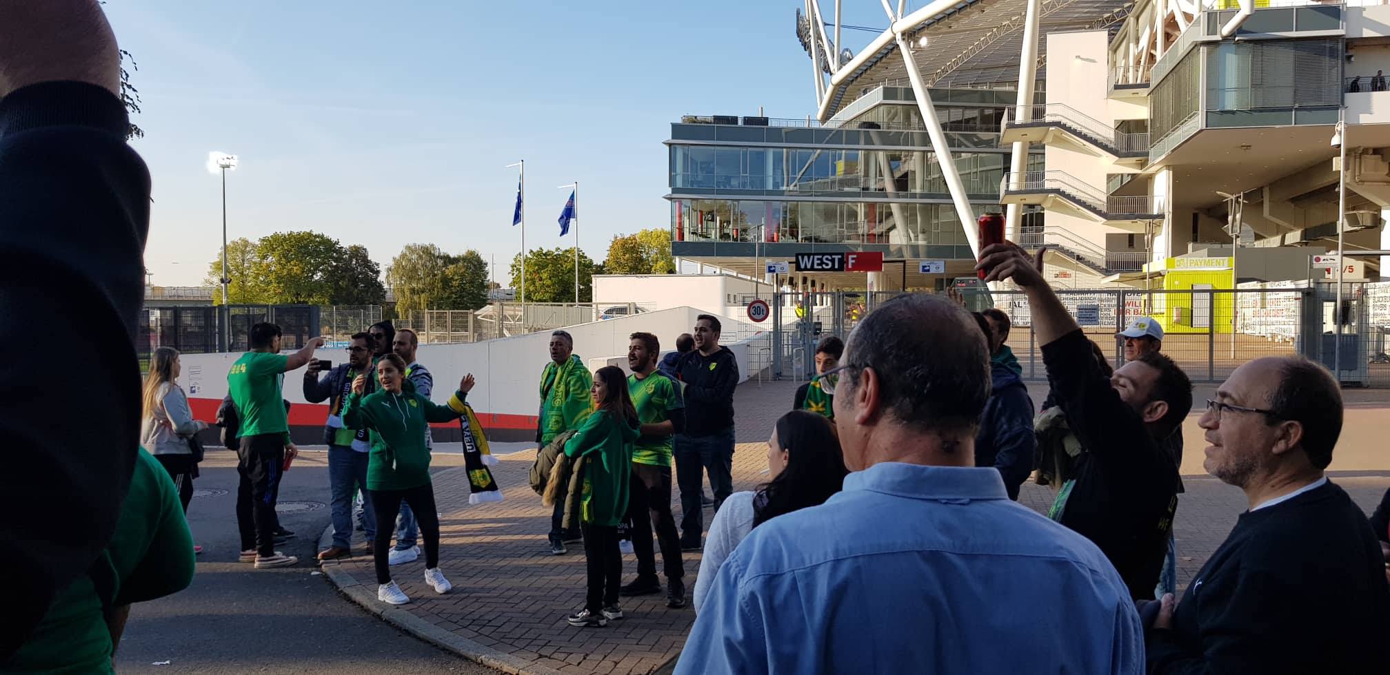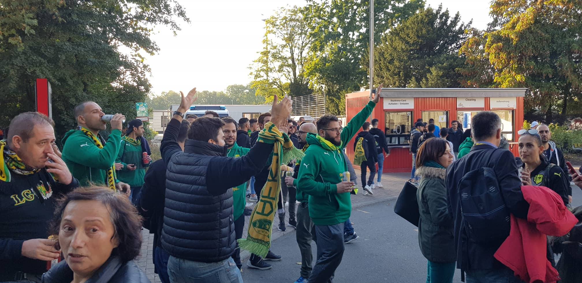 Αρκετοί φίλοι της ΑΕΚ βρίσκονται έξω από το γήπεδο της Λεβερκούζεν και προετοιμάζονται με συνθήματα για τον σημερινό αγώνα κόντρα στην Γερμανική ομάδα στο πλαίσιο της 2ης αγωνιστικής των ομίλων του Γιουρόπα Λιγκ.
