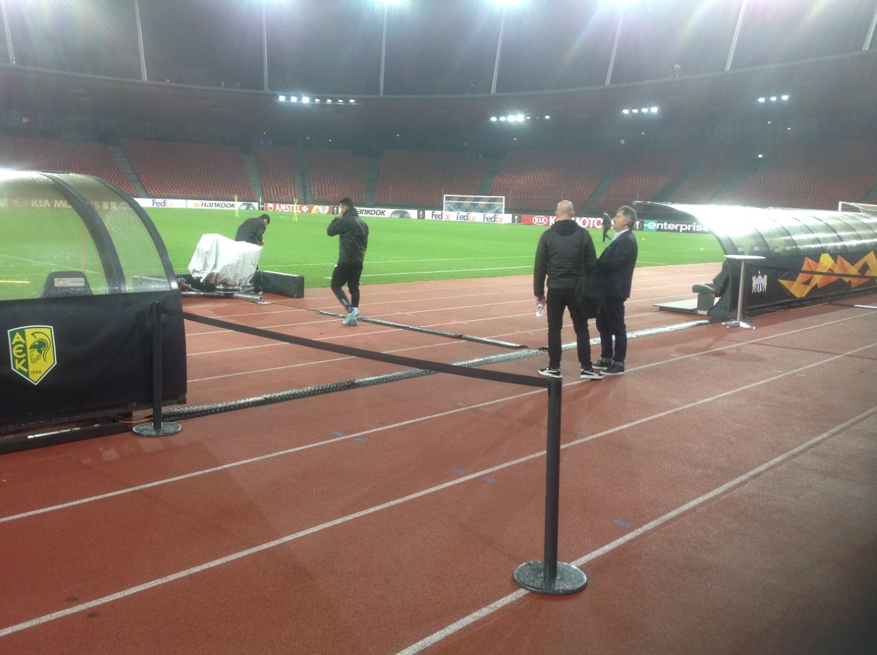 Το γήπεδο ήταν ήδη στολισμένο στα χρώματα του Γιουρόπα Λιγκ όταν οι ποδοσφαιριστές της ΑΕΚ μπήκαν για να πάρουν μια πρώτη γεύση από τον αγωνιστικό χώρο, ολοκληρώνοντας την προετοιμασία τους για το παιχνίδι. Το έμβλημα με τον Κίμωνα καθόριζε ήδη τις θέσεις που θα πάρουν οι αναπληρωματικοί και το προπονητικό επιτελείο της ΑΕΚ.