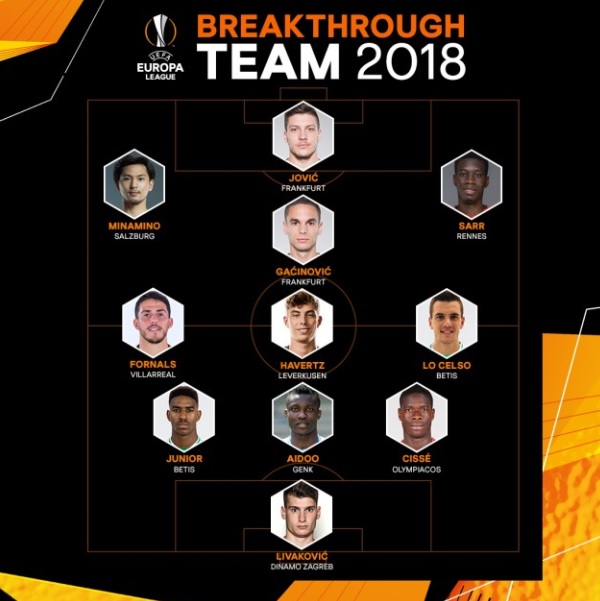 Ντομινίκ Λιβάκοβιτς (Ντιναμο Ζάγκρεμπ), Σισέ (Ολυμπιακός), Ζόζεφ Έντου (Γκενκ), Ζούνιορ Φίρπο (Μπέτις), Μιγιάτ Γκατσίνοβιτς (Άιντραχτ Φρανκφούρτης), Χιοβάνι λο Σέλσο (Μπέτις), Κάι Χάβερτς (Λεβερκούζεν), Πάμπλο Φορνάλς (Βιγιαρεάλ), Ισμαΐλα Σαρ (Ρεν), Λούκα Γιόβιτς (Άιντραχτ Φρανκφούρτης), Τακούμι Μιναμίνο (Σάλτσμπουργκ).