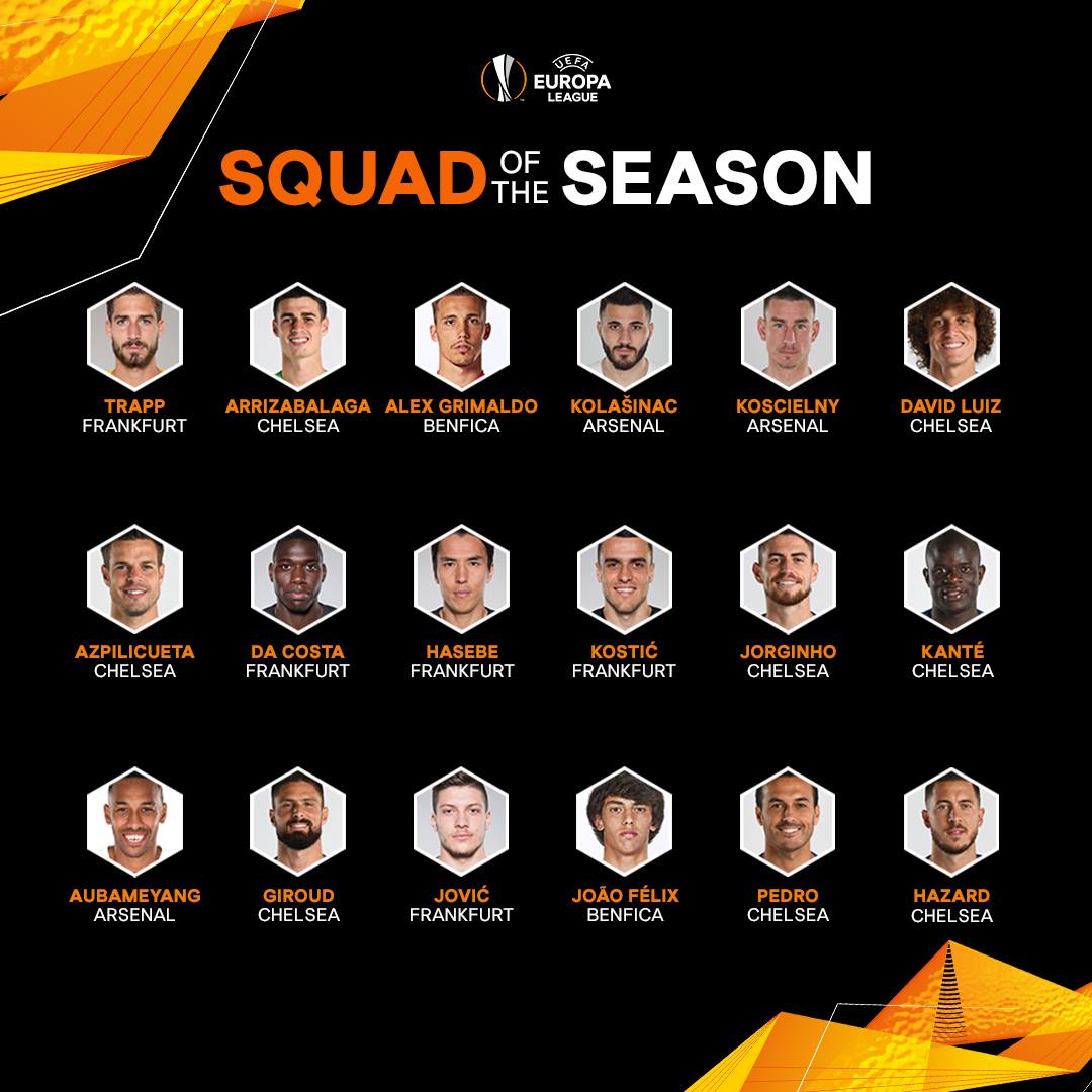 Με 8 ποδοσφαιριστές της Τσέλσι που κατέκτησε το τρόπαιο στον τελικό του Μπακού και 5 από πλευράς της εντυπωσιακής Άιντραχτ Φρανκφούρτης ανακοινώθηκε η κορυφαία 18άδα της διοργάνωσης για τη φετινή σεζόν.