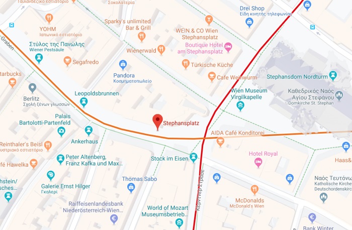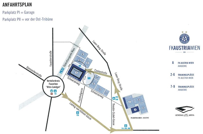 Από το συγκεκριμένο σημείο, οι οπαδοί μας θα μεταβούν στο γήπεδο χρησιμοποιώντας την κόκκινη γραμμή του Μετρό U1 και θα κατέβουν στην στάση “Troststrasse”.