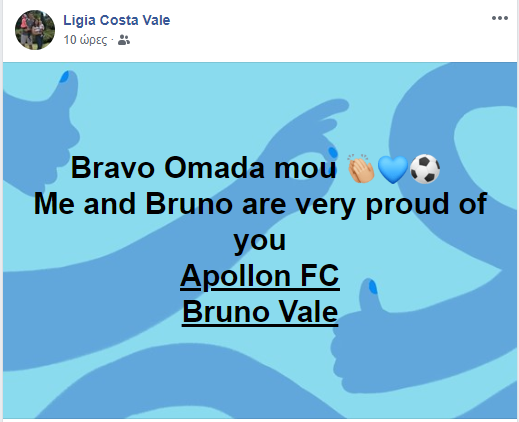 Με ανάρτηση στα social media η οικογένεια Βάλε κάνουν αναφορά στην πρόκριση του Απόλλωνα στα πλέι οφ του Γιουρόπα Λιγκ. Ο πρώην τερματοφύλακας του Απόλλωνα και η σύζυγος του νιώθουν περήφανοι για όσα πετυχαίνει μέχρι στιγμής η ομάδα.