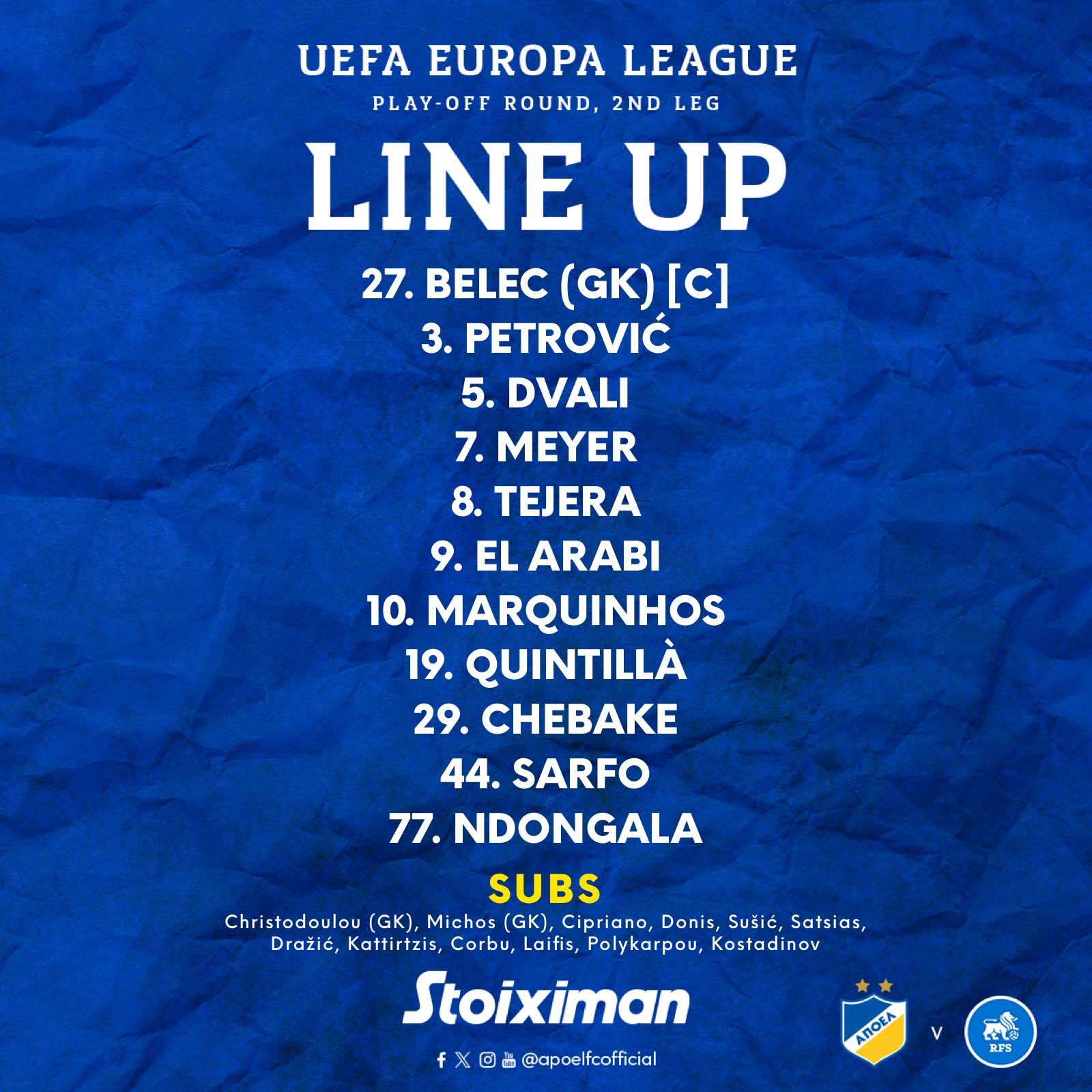ΑΠΟΕΛ: Μπέλετς, Σεμπάκ, Πέτροβιτς, Ντβάλι, Κιντιγιά, Τεχέρα, Σαρφό, Ντονγκάλα, Μάιερ, Μαρκίνιος, Ελ Αραμπί.
