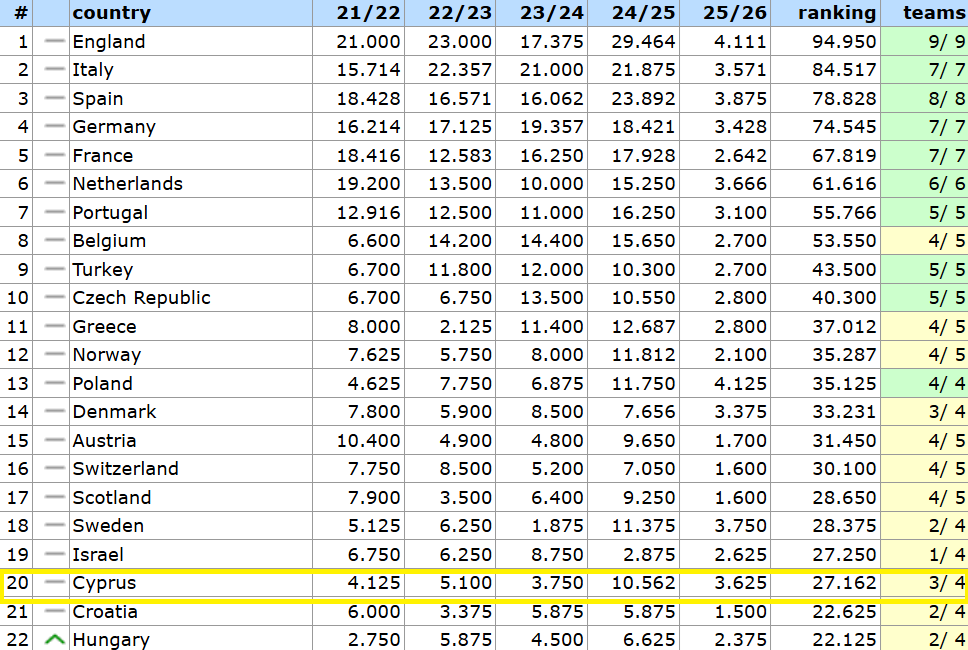 Παραμένει στην 20η θέση η Κύπρος στην κατάταξη της ΟΥΕΦΑ μετά τα ψεσινά αποτελέσματα σε Νορβηγία και Αυστρία για ΑΕΚ και Ομόνοια αντίστοιχα.