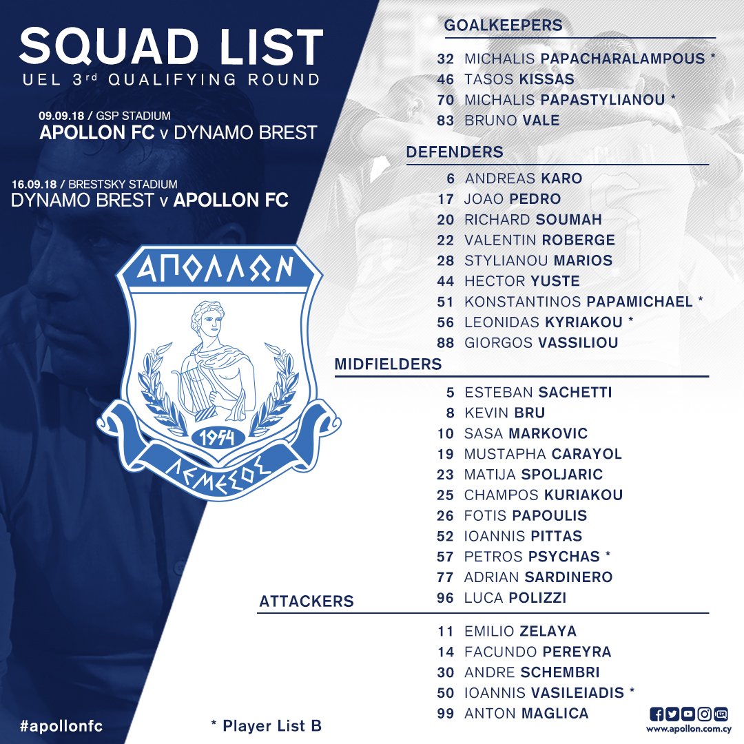 Με τον Μουσταφά Καραγιόλ στον κατάλογο, ο Απόλλωνας ανακοίνωσε τους παίκτες που είναι στη λίστα για τον γ' προκριματικό γύρο του Γιουρόπα Λιγκ για τα παιχνίδια με την Δυναμό Μπρεστ. Δεν ενσωματώθηκε στον κατάλογο το τελευταίο απόκτημα της ομάδας, Ουεντραόγκο Ντίλαν.