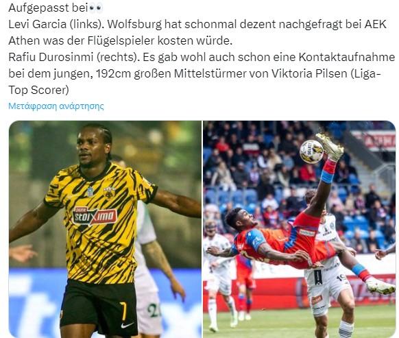 Βάσει, λοιπόν, γερμανικού tweet «η Βόλφσμπουργκ έχει ήδη ρωτήσει διακριτικά την ΑΕΚ πόσο θα κόστιζε ο Λιβάι Γκαρσία» με την υποσημείωση, μάλιστα, πως οι Γερμανοί θεωρούν πως ο παίκτης μπορεί να αποδώσει εξίσου καλά τόσο ως εξτρέμ όσο και ως σέντερ φορ.
