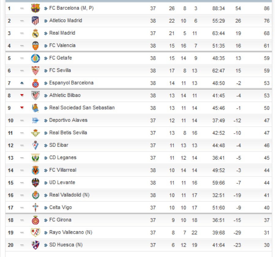 Ηταν μία συγκλονιστική μέχρι τέλους μάχη για την 4η θέση, με τις Βαλένθια, Χετάφε και Σεβίλλη να παλεύουν για το όνειρο. Τελικά το εισιτήριο για το Champions League βρέθηκε στα χέρια της πρώτης. Οι Νυχτερίδες που έκαναν τρομερό come back στον β' γύρο και αφού πολύ πρόσφατα πλησίασαν στην τετράδα. Σολέρ (36') και Ροντρίγκο (52') καθάρισαν για το πολύτιμο τρίποντο και η ομάδα τους πέρασε με 0-2 από τη σωμένη Βαγιαδολίδ και θα βρεθεί στους ομίλους της επόμενης διοργάνωσης.