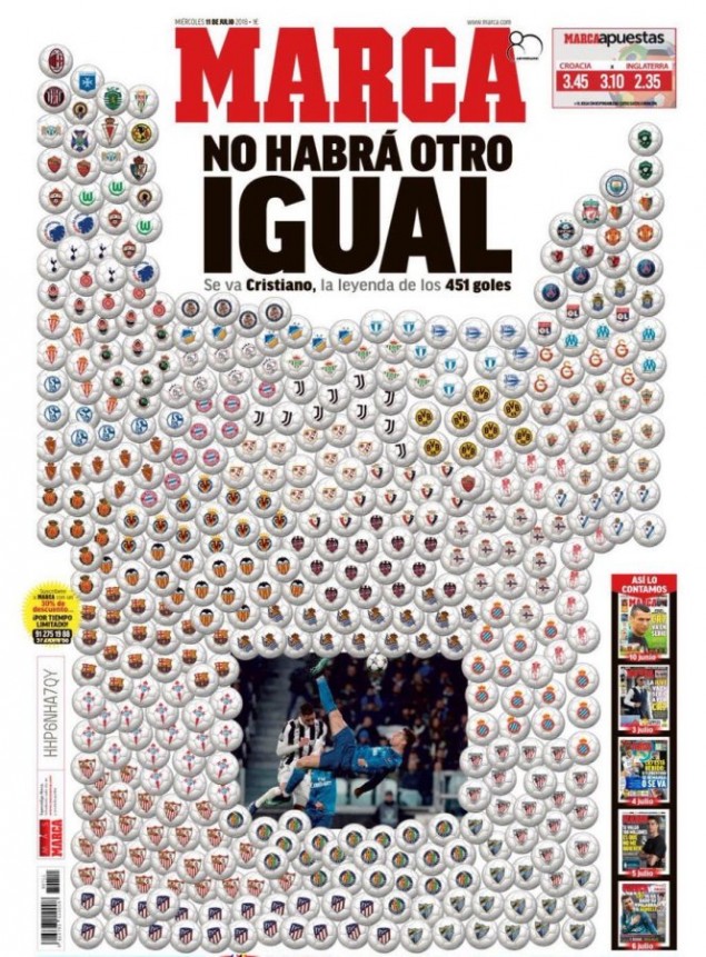 Η Marca θέλησε να αποχαιρετήσει τον Κριστιάνο και ετοίμασε ένα μοναδικό πρωτοσέλιδο με τίτλο: «Δεν θα υπάρξει ποτέ ξανά κάποιος σαν αυτόν» και φωτογραφία από το ψαλιδάκι που είχε πιάσει στο ματς με τη Γιούβε.