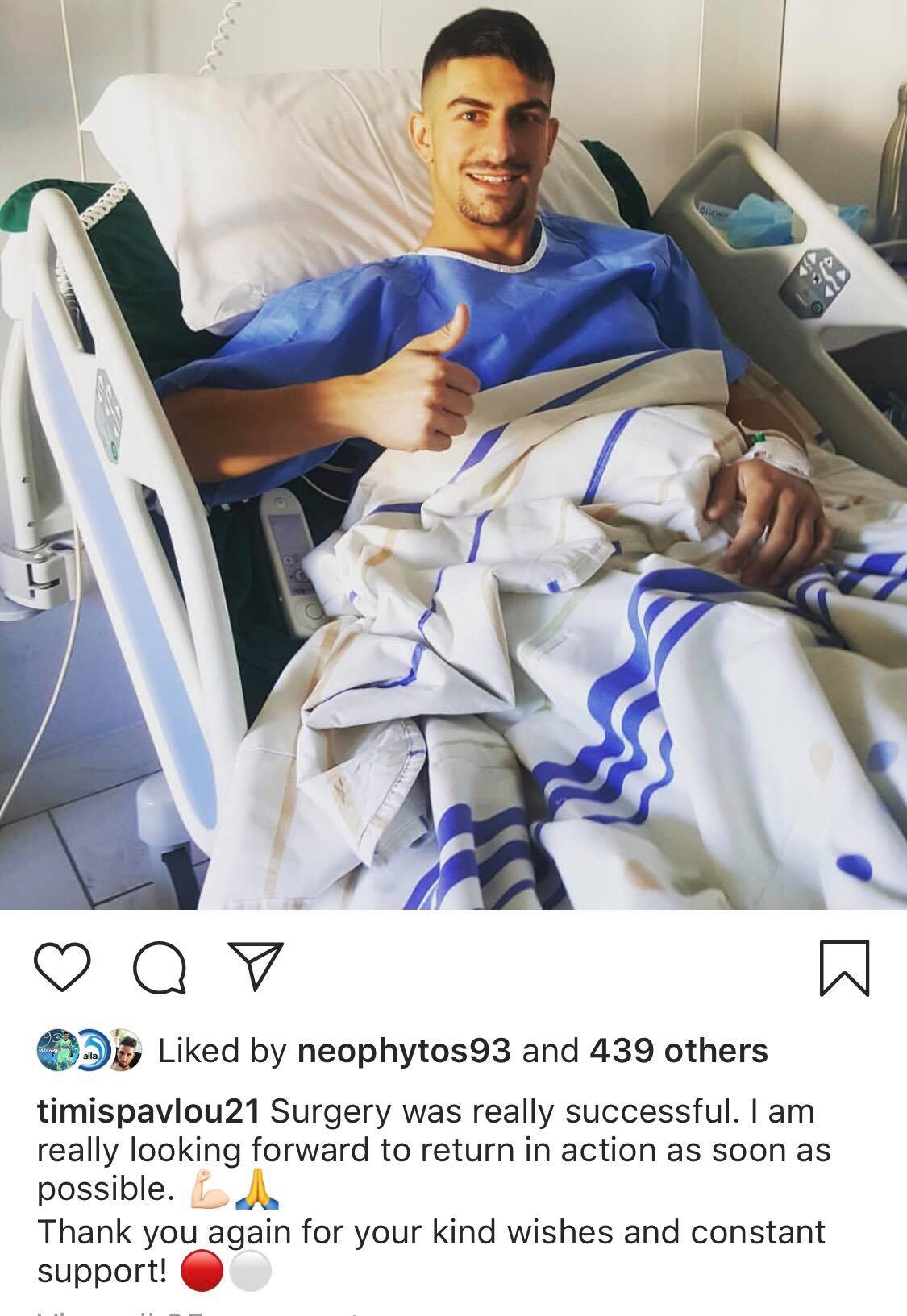 "Η επέμβαση ήταν πολύ επιτυχημένη. Ανυπομονώ πραγματικά να επιστρέψω στην δράση το συντομότερο δυνατό. Σας ευχαριστώ και πάλι για τις ευχές σας και τη συνεχή υποστήριξη”!, έγραψε ο ποδοσφαιριστής της Νέας Σαλαμίνας.