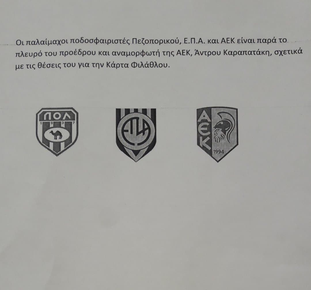 Οι παλαίμαχοι ποδοσφαιριστές της ΕΠΑ, Πεζοπορικού και ΑΕΚ είναι στο πλευρό του προέδρου της ΑΕΚ, Άντρου Καραπατάκη σε σχέση με τη θέση του για τον κάρτα φιλάθλου.