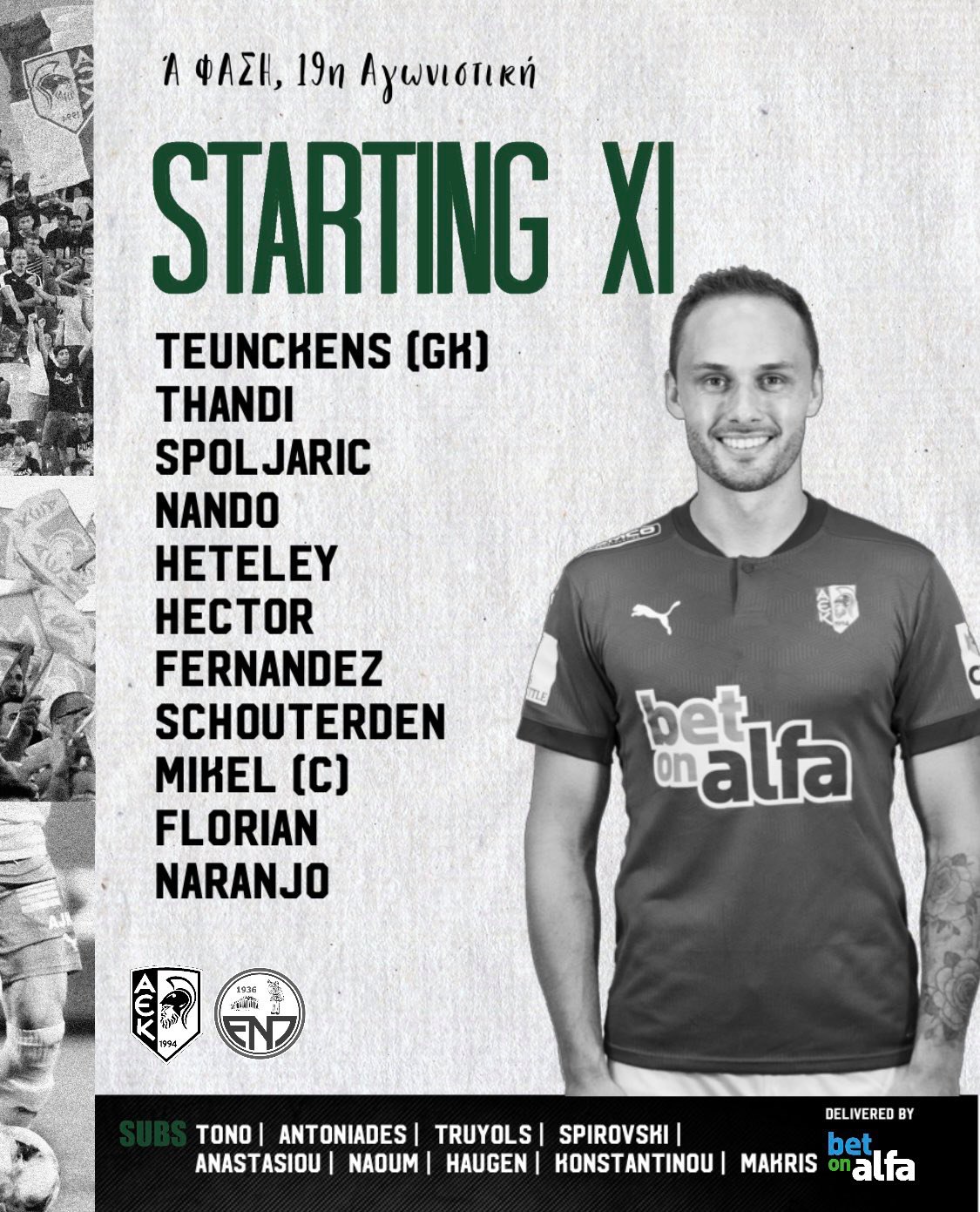Ο Σωφρόνης Αυγουστή παρατάσσει την ομάδα του με την ακόλουθη ενδεκάδα: Τένκενς - Τάντι, Γκονθάλεθ, Τόρες - Φερνάντεθ, Σπόλιαριτς, Χέιτλι, Σχάουτερντεν - Γκαρθία, Ναράνχο - Τολμές.
