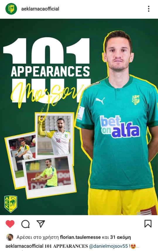 Στο σημερινό παιχνίδι της ΑΕΚ, ο Ντάνιελ Μόισοφ πραγματοποίησε την 101η του συμμετοχή με την ομάδα της Λάρνακας για το πρωτάθλημα. Η ΑΕΚ δημοσίευσε στα social media την πιο κάτω φωτογραφία με το επίτευγμα του Σκοπιανού αμυντικού.