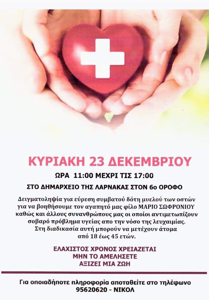 Η Αθλητική Ένωση Κίτιον (ΑΕΚ) Λάρνακας καλεί όλο το φίλαθλο κόσμο να παραστεί στην αιματολογική δειγματοληψία για εύρεση συμβατού δότη μυελού των οστών για το Μάριο Σοφρωνίου, καθώς και άλλους συνανθρώπους μας που αντιμετωπίζουν πρόβλημα υγείας από την νόσο της λευχαιμίας.