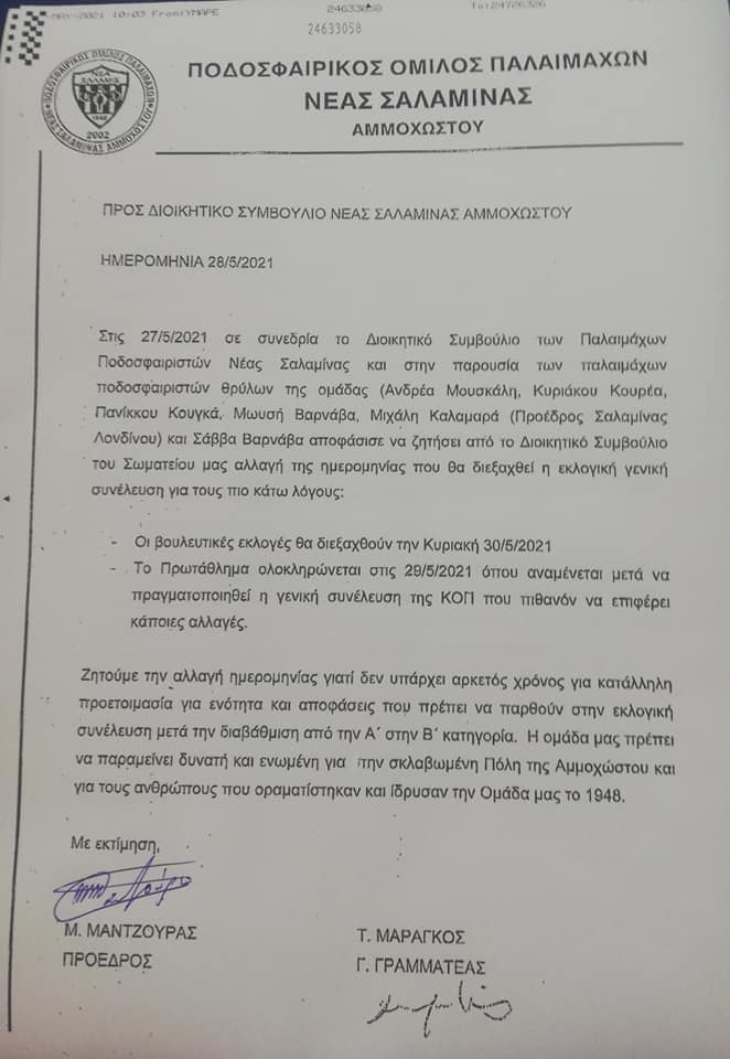 Ο Όμιλος Παλαιμάχων της Νέας Σαλαμίνας με την πιο κάτω επιστολή ζητά την αναβολή της Εκλογικής Γενικής Συνέλευσης.