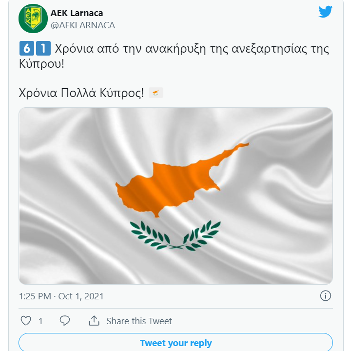 Ανάρτηση της ΑΕΚ για την Κύπρο (pic) Α' ΚΑΤΗΓΟΡΙΑ ΑΕΚ 01.10.202113:55 Η ΑΕΚ κάνει αναφορά με ανάρτηση της στην σημερινή επέτειο της 1ης Οκτωβρίου. Αναλυτικά: sfrr.png