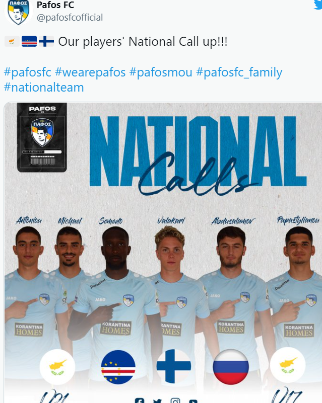 Οι διεθνείς της Πάφου (pic) Α' ΚΑΤΗΓΟΡΙΑ ΠΑΦΟΣ FC 04.10.202117:46 Η Πάφος με ανάρτηση της ενημερώνει για τους παίκτες που έχουν κληθεί στις Εθνικές τους ομάδες. Αναλυτικά: ssr.png