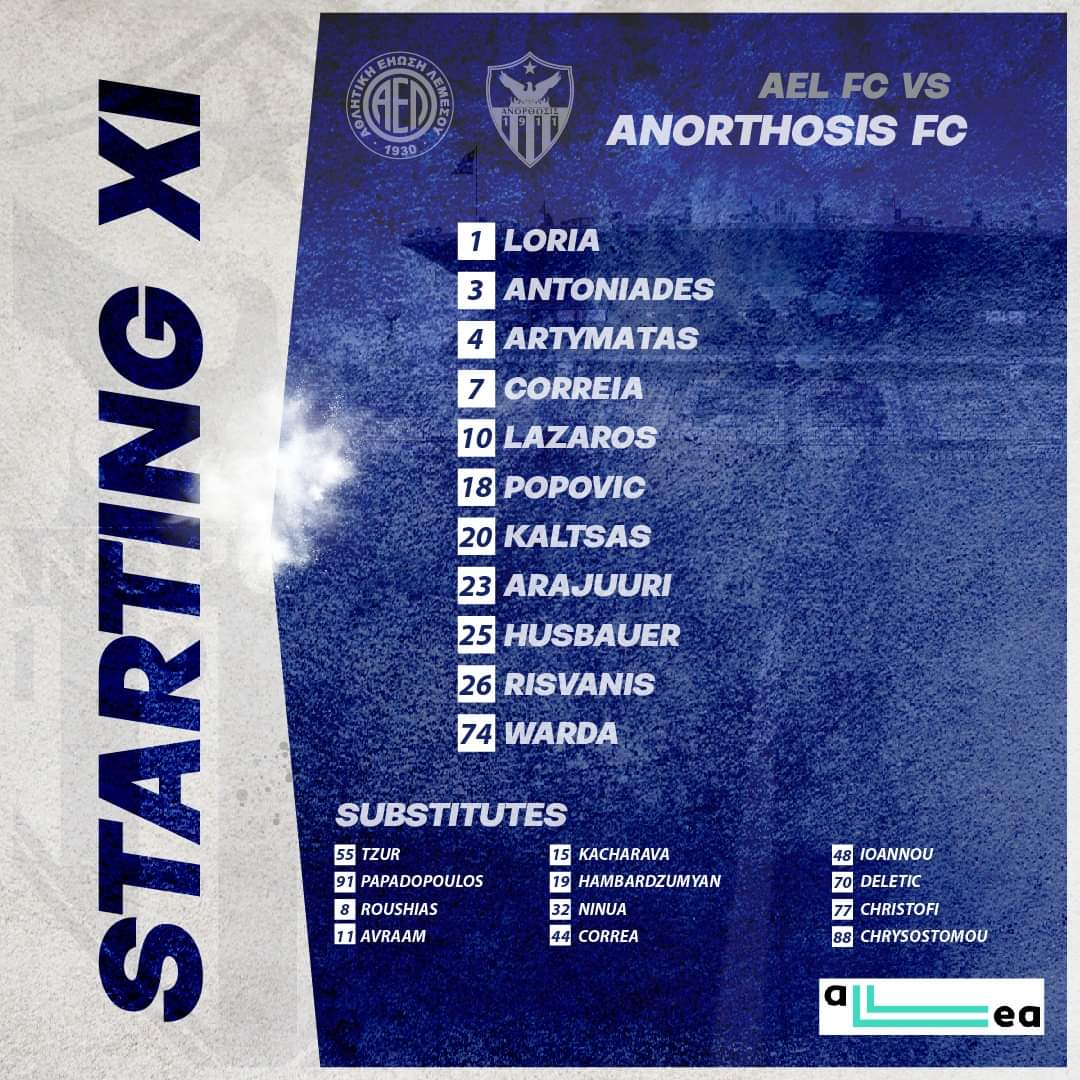 Στον πάγκο για την Ανόρθωση: Τζουρ, Παπαδόπουλος, Ρουσιάς, Αβραάμ, Κατσαράβα, Αμπαρτζουμιάν, Νινούα, Κο΄ρέα, Ιωάννους, Ντέλετιτς, Χριστοφή, Χρυσοστόμου