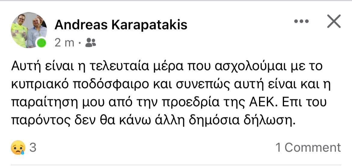 Aπίστευτη εξέλιξη που δεν περίμενε κανείς! Ο Άντρος Καραπατάκης με ανάρτησή του στο facebook αναφέρει πως παραιτείται από την προεδρία της ομάδας: