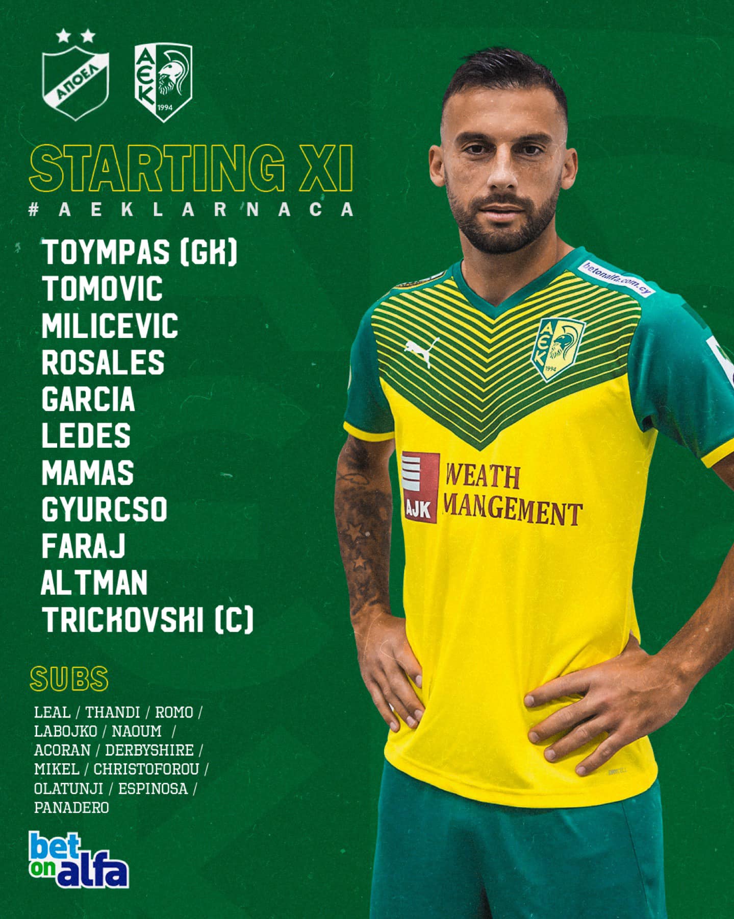 ΑΕΚ: Τούμπας - Ροσάλες, Τόμοβιτς, Μιλίτσεβιτς, Γκαρθία - Μάμας, Λέντες - Φαράζ, Αλτμάν, Γκιούρτσο - Τριτσκόβσκι.