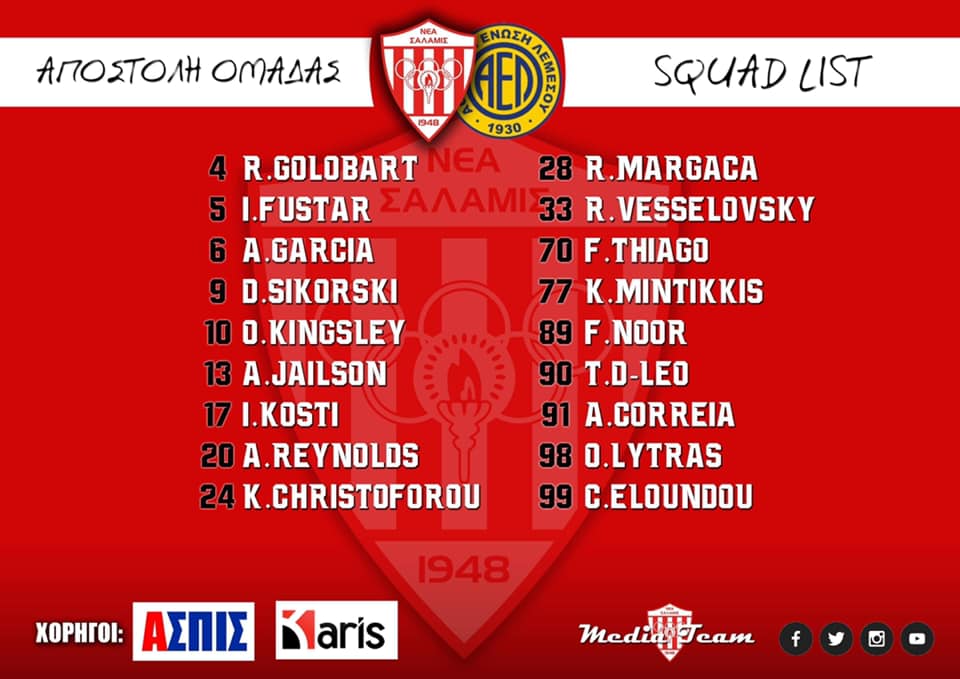 Η Νέα Σαλαμίνα ολοκλήρωσε την προετοιμασία της για το αυριανό παιχνίδι με την ΑΕΛ στο "Αμμόχωστος". Αμέσως μετά ο Σάββας Πουρσαϊτίδης ανακοίνωσε την αποστολή της ομάδας.