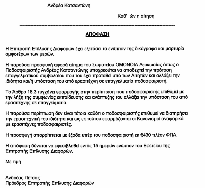 Υπενθυμίζουμε ότι η προσφυγή της Ομόνοιας απορρίφθηκε και ο ποδοσφαιριστής παραμένει ερασιτέχνης. Ως εκ τούτου, στην περίπτωση του ποδοσφαιριστή θα εφαρμοστούν οι κανονισμοί περί ερασιτεχνών ποδοσφαιριστών.