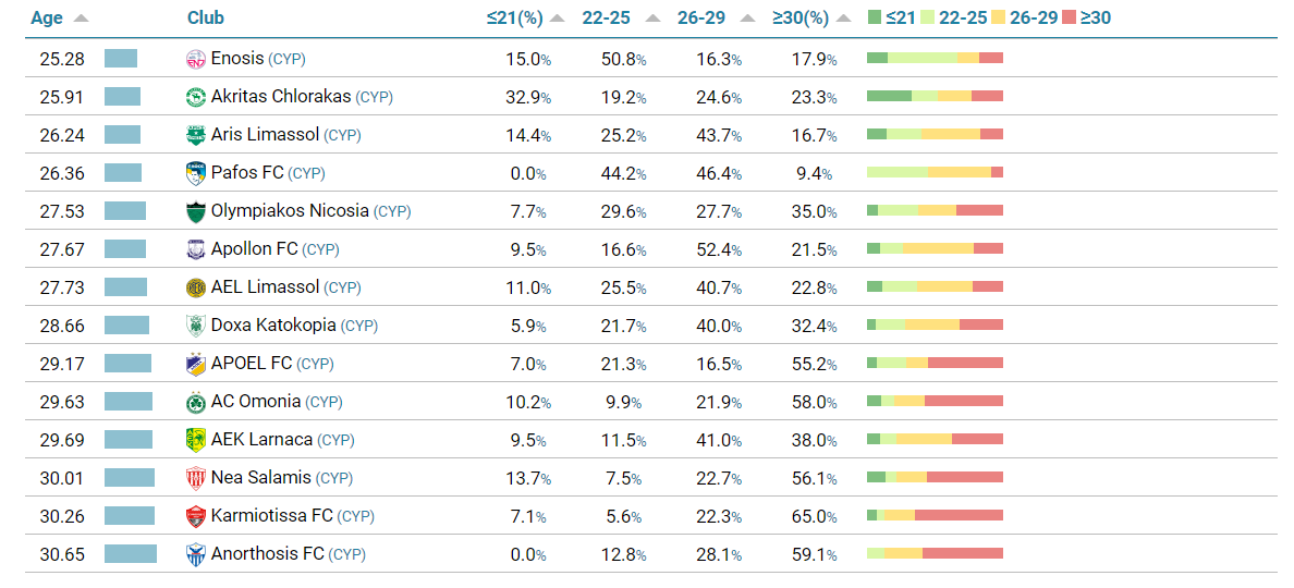 Η Ένωση είναι η ομάδα που παρουσιάζει το μικρότερο μέρο όρο ηλικίας (25,28 χρόνια) στο πρωτάθλημα Cyta, ενώ η Ανόρθωση έχει το μεγαλύτερο ποσοστό (30,65) ως η πιο γερασμένη ομάδα στην Κύπρο. Από τις έξι μεγάλες ομάδες του νησιού, ο Απόλλωνας είναι η νεότερη ομάδα με ποσοστό 27,67.