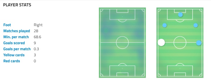 Αγωνίστηκε για 3747 λεπτά στο σύνολο, έχει 9 γκολ στο πρωτάθλημα, δύο στο κύπελλο και μηδέν ασιστ. Τα σουτ του στον στόχο έφτασαν με βάση πάντα τη πλατφόρμα wyscout στο 35,2%, ενώ τα αναμενόμενα του γκολ έφτασαν στο 8,7%. Οι πάσες του είχαν μεγάλο ποσοστό επιτυχίας (73%) και οι ντρίμπλες του στο 66%.